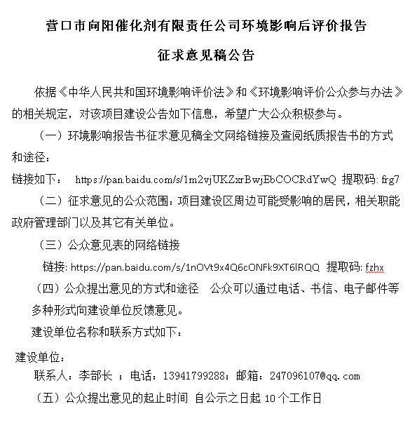 營口市向陽催化劑有限責(zé)任公司環(huán)境影響后評價報告 征求意見稿公告