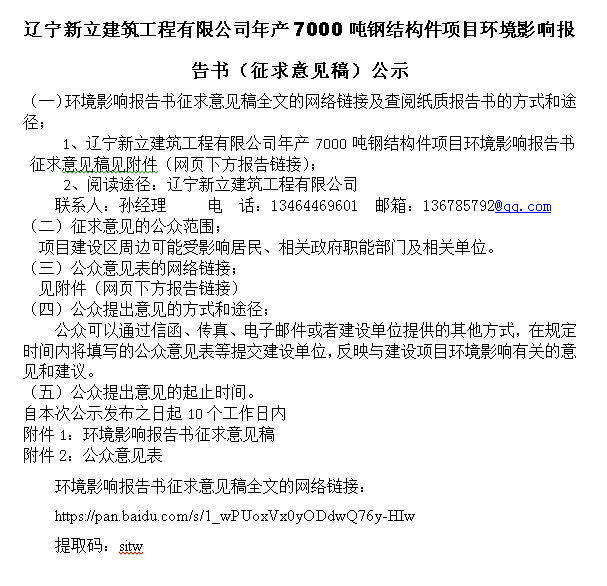 遼寧新立建筑工程有限公司年產(chǎn)7000噸鋼結(jié)構(gòu)件項(xiàng)目環(huán)境影響報(bào)告書(shū)(征求意見(jiàn)稿)公示